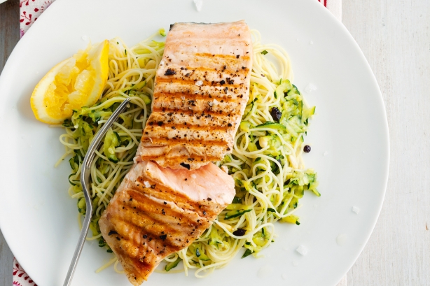 Salmão marinado com espaguete de courgette